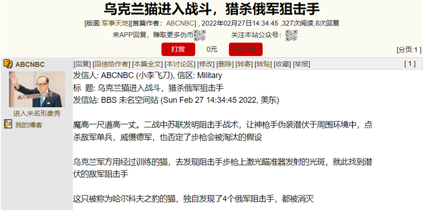 近日,某中文论坛流传一则“萌宠传说”。据说乌克兰军方训练出了一只名为“哈尔科夫之豹”的猫,独自发现了4个俄军狙击手行踪。