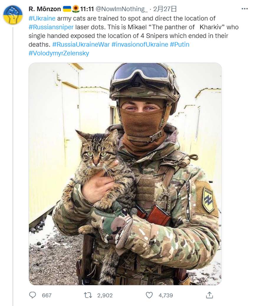 - 乌军猫“米卡埃尔”暴露4名俄军狙击手行踪,被称为“哈尔科夫之豹”消息不实。该说法来自推特网友@NowImNothing_,图来自@UAarmy_animals于2018年发布的推文。