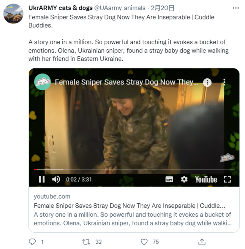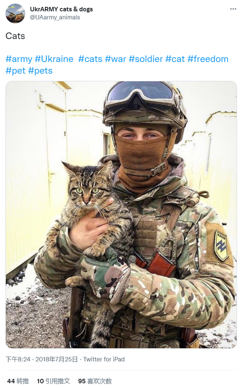 @UAarmy_animals是一个位于基辅的账号,2016年4月加入,有5000余名粉丝。多年来,该账号一直坚持发布乌克兰军人与猫、狗等各种动物的合影。但是,他发布的这些动物并不都是军队饲养和训练的“军宠”。例如,2月20日,该账号曾经转载一则题为《女狙击手救了一只流浪狗,现在他们无法分开》的YouTube视频。@UAarmy_animals写道:“乌克兰狙击手奥莲娜,在东乌克兰和她朋友一起走路的时候,找到了一只流浪的小狗。”