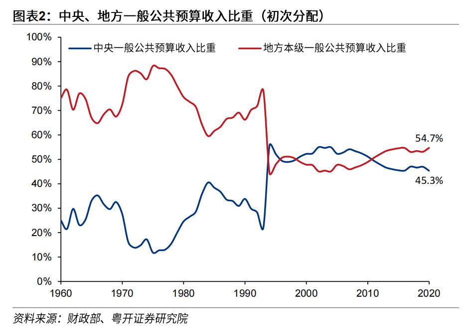 1994年分税制改革后,中央一般公共预算收入占比上升,中央与地方形成两次分配关系。第一次分配按照分税制的财政管理体制,中央和地方划分税种和收入,分为中央税、地方税和共享税。同时,税权高度集中,税收立法权统一于中央。第二次分配则通过中央统筹,对地方进行各类“补助”,其中中央对地方的转移支付制度是重点,意在均衡区域间的财力,促进各地基本公共服务均等化。