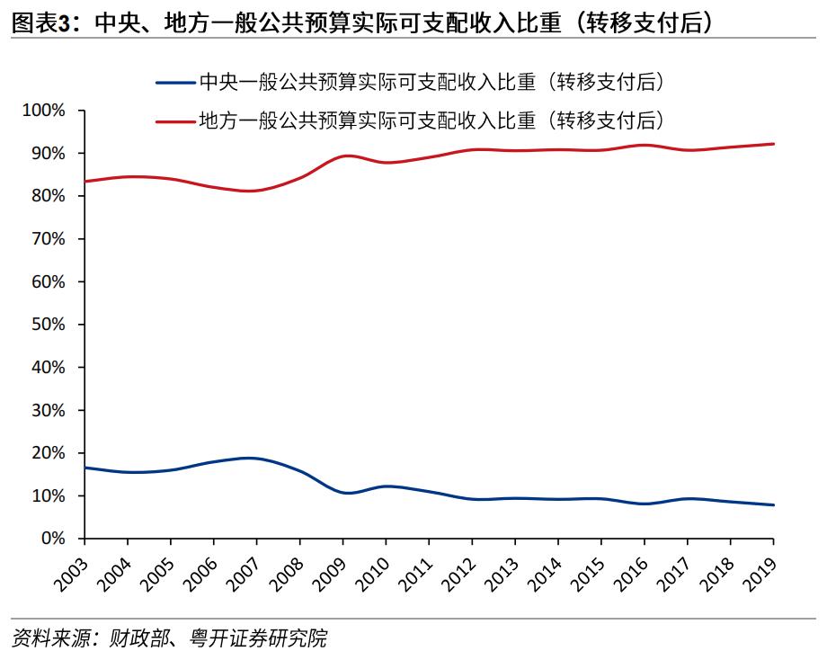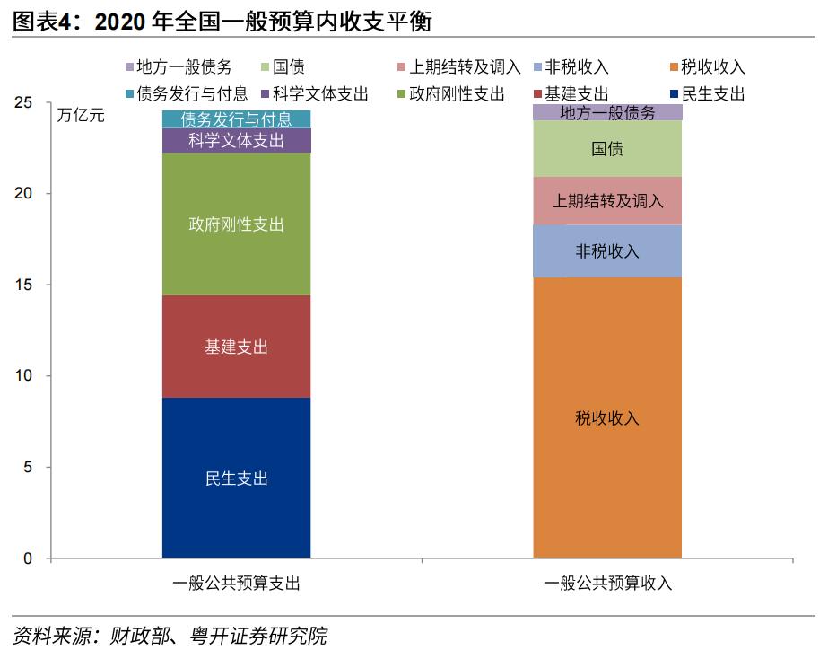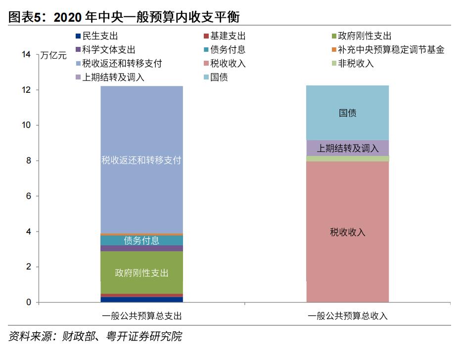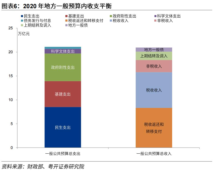 第二,中央政府财政支出的核心功能在于纾解地方财政困局、平衡地区经济发展、促进地方基本公共服务均等化。相比于收入,中央的支出责任占比低,大部分收入均用于对地方的转移支付。地方财政更多承担当地经济建设及科教文卫等直接支出。2020年,中央一般公共预算支出规模达到11.8万亿,其中本级一般公共预算支出3.5万亿元,远低于对地方转移支付的8.3万亿。地方政府基建、民生支出分别达到5.4万亿元和8.5万亿元,分别占地方一般公共预算支出的25.6%和40.3%。同时,以区域平衡发展为目标的转移支付占中央转移性支付比突出。中央政府对地方政府的转移性支付主要包含税收返还与转移支付(一般、专项)两个层面。税收返还是分税制改革的产物,可以视作是财政制度下地方政府“收入”的一部分。而转移支付则是中央政府用以平衡区域发展的重要工具。2020年中央政府对地方政府税收返还总额约为1.1万亿元,一般、专项及特殊转移支付约为7.2万亿,两者占比分别为13.5%及86.5%,具有“平衡区域发展”作用的转移支付占比突出。