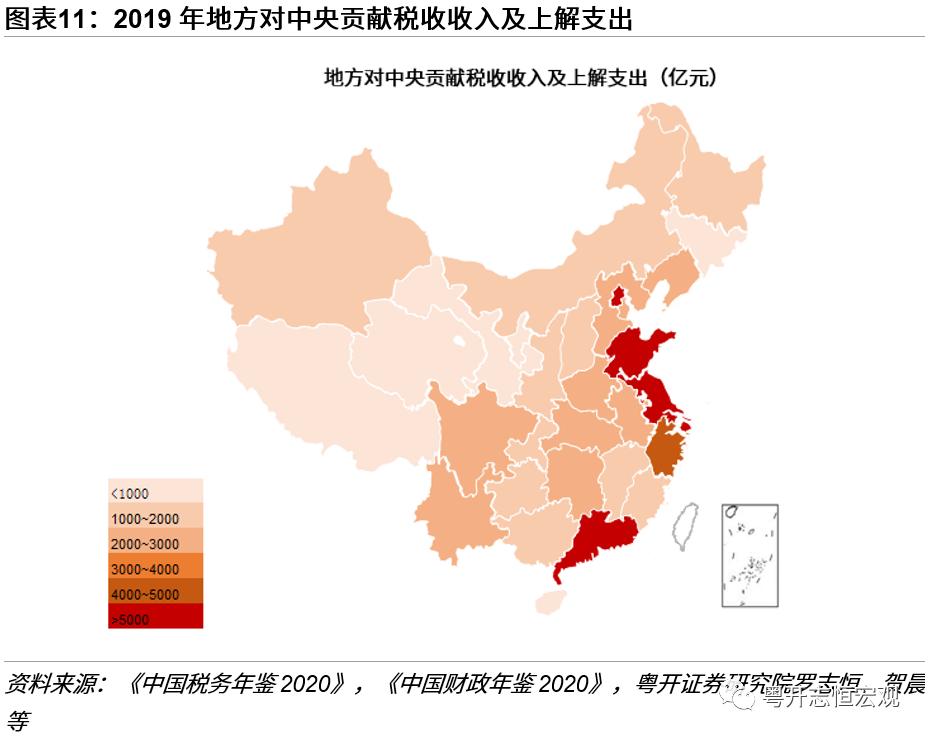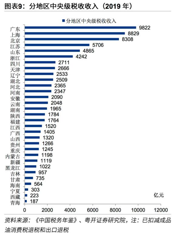 2、地方创造的财政收入中,东部发达地区对中央财政收入的贡献大。财政与经济是一体两面的关系,2019年广东(10309亿元)、上海(9102亿元)、北京(8441亿元)、江苏(6116亿元)等东部发达地区贡献的中央级税收收入及上解支出等领跑全国,青海(193亿元)、西藏(225亿元)、宁夏(309亿元)等西部地区贡献排名靠后。