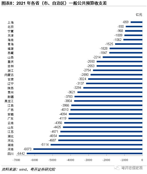 近年来,市场上同样有“仅上海有财政盈余”的讨论,并据此解读国内财政形势。根据各省一般公共预算收支差简单计算,2021年前三季度31个省市中仅上海市盈余958.7亿元,其余30个省市均存在收不抵支问题。2021年全年31省市一般公共预算收支均为负数。