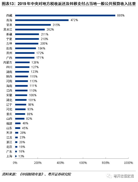 3、中央对中西部地区转移支付规模大,成为中西部省份财政收支差的主要弥补来源(东部地区除转移支付外,还有发债弥补)。2019年中央对四川(5173亿元)、河南(4576亿元)、云南(3814亿元)、湖南(3694亿元)等中西部人口和农业大省的转移支付规模较大。对西藏、青海、甘肃、黑龙江、新疆、宁夏等省份财力补充效果较为明显,中央转移性收入分别占地方一般公共预算收支缺口的99.9%、84.3%、86.4%、88.2%、89%、和87.7%。