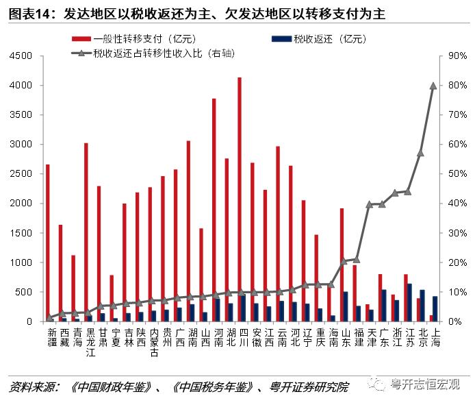 进一步从转移支付的内部结构来看,江苏、广东等东部经济发达地区的转移性收入以税收返还为主。中央对经济相对落后地区的转移性支出以具有平衡区域发展功能的转移支付为主。由于“基数返还”的特性,据我们简单测算,江苏(631亿元)、广东(530亿元)、北京(528亿元)、山东(495亿元)等经济发达、纳税数额大的地区获得税收返还数量最多,占全国总额的7.9%、6.6%、6.6%及6.2%。青海(34亿元)、新疆(36亿元)、宁夏(45亿元)、西藏(47亿元)等经济相对落后地区获得税收返还数量垫底。在税收返还占转移性收入比重来看,上海、北京、江苏、浙江等经济发达地区税收返还占转移性收入比重高,占比分别为80.0%、57.2%、44.1%及43.6%;新疆、西藏青海及黑龙江的转移性收入以一般转移支付为主,税收返还占比仅为1.4%、2.8%、2.9%及3.1%。