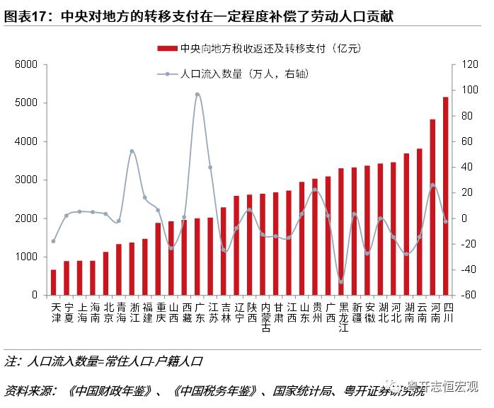 第四,经济发展领先地区的发展成果不是其单打独斗的结果。改革开放后,我国中、西部地区为东部地区工业经济发展贡献了大量的劳动人口,区域间人口流动推动了东部地区经济的快速崛起。作为经济社会发展的要素,人口的地区间流动不仅促进了人力资本的再配置,同时也推动了资金、信息、技术等要素的跨区域流动。作为人口流出地的部分中西部地区,青壮年劳动力流失,工业化经济发展受阻,地方财政创造能力弱;留守老弱孕童,进一步给当地教育、社会保障、医疗保障等相关财政支出增添负担。以常住人口-户籍人口衡量人口流入流出,2019年黑龙江、湖南及安徽是我国人口流出最多的三个地区,人口流出分别为49.6、27.8及27.4万人;广东(96.8万人)、浙江(52.5万人)及江苏(39.9万人)人口流入最多。中央对人口流出地的转移支付一定程度上补偿了中、西部地区对东部地区经济发展的劳动人口贡献。