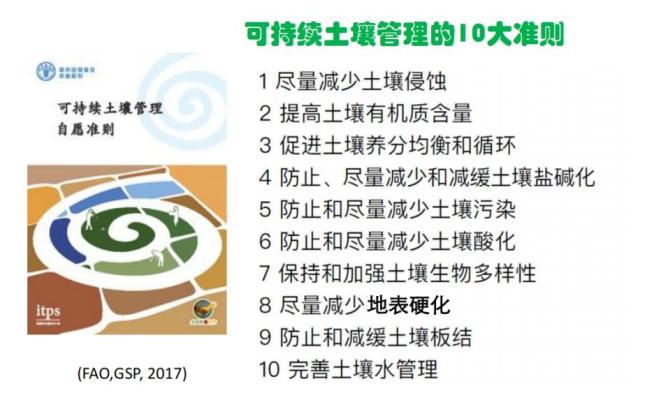 2017年,联合国粮食及农业组织(FAO)提出了可持续土壤管理的十大准则。这十大准则也是我们土地利用管理,农业可持续发展当中,怎么把土壤质量保护好,使它可持续地进行农业生产种植的最主要的原理或准则。