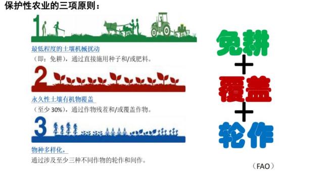 联合国粮食及农业组织(FAO)提出了保护性农业原则:免耕、覆盖、轮作