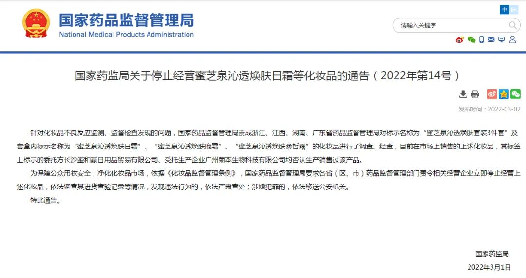 3月2日,国家药监局发布关于停止经营蜜芝泉沁透焕肤日霜等化妆品的通告。