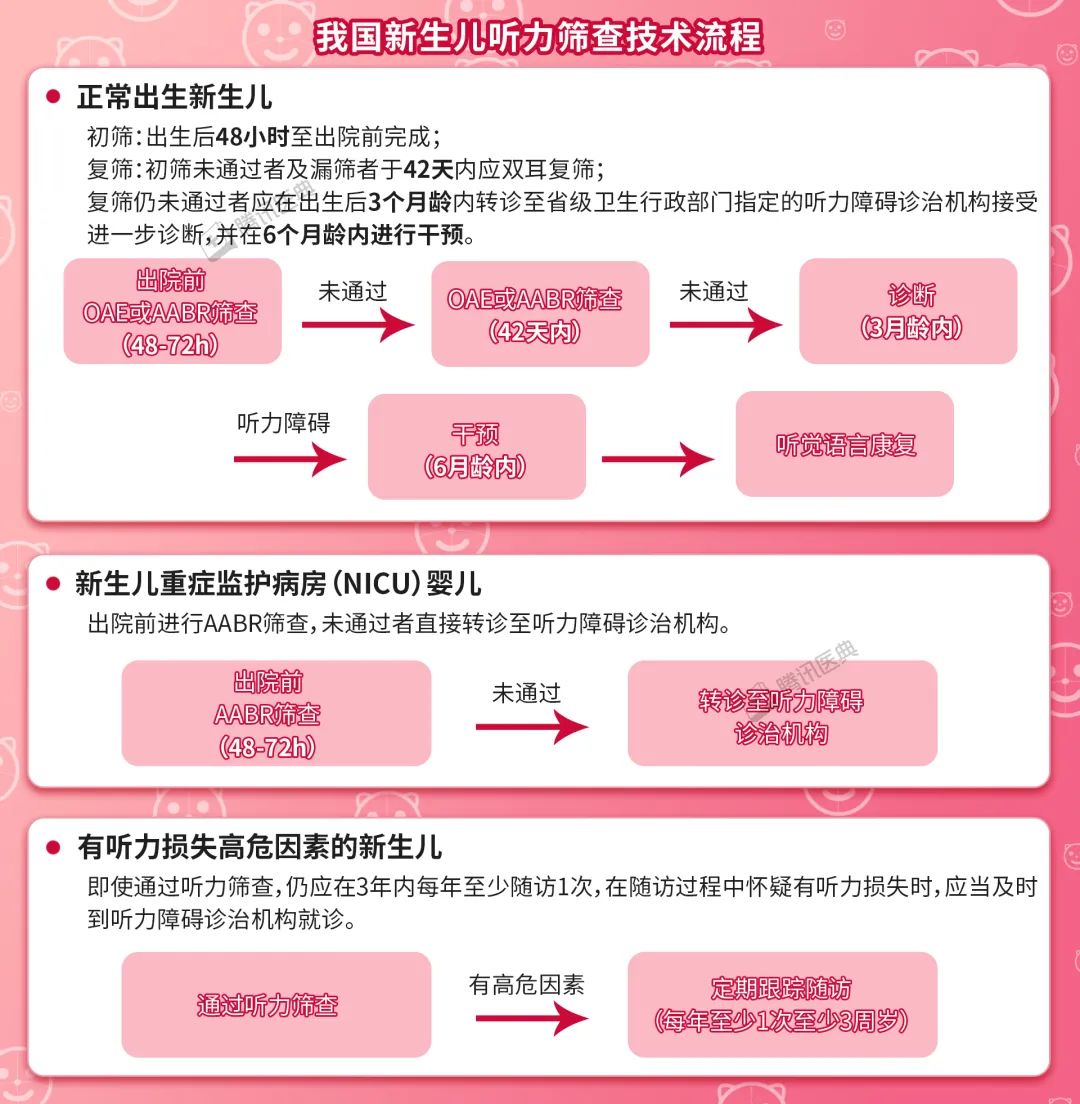 通过新生儿听力筛查,在儿童早期提供干预,让出生时有听力损失的儿童也可以发展适合其年龄的言语和语言技能,并可以与听力正常的同龄人在同一教室开始正式教育。敲黑板: