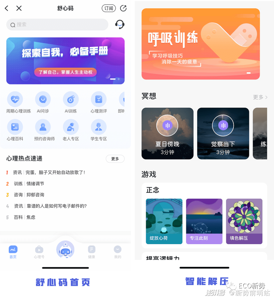 此外,该应用还能建立个人身心健康档案,运用科学诊断量表,自主研发的评估系统和人机交互评估民众的心理健康状态。不仅如此,连白领们青睐的冥想、正念、呼吸训练、记忆力训练等心理化训练、工具及游戏,都能通过一个app实现。