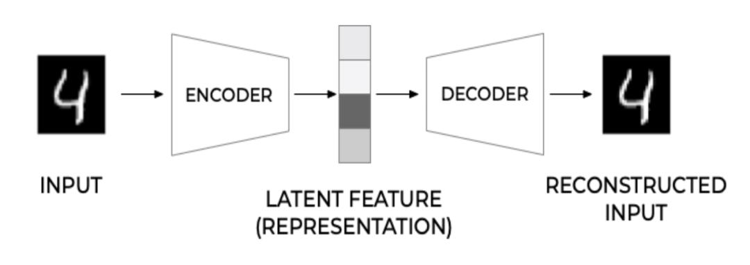 图 1:自动编码器的一般架构。一般来说,我们希望自编码器能够很好地重建输入。同时,它还应该创建一个有用且有意义的潜在表示 (图 1 中编码器部分的输出)。例如,手写数字上的潜在特征可以是写每个数字所需的行数,或者每条线的角度以及它们之间的连接方式。