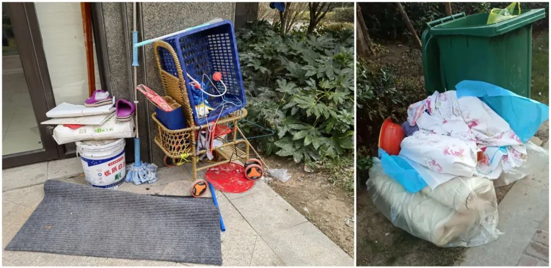 记者随机来到一栋居民楼,发现垃圾桶旁、单元门外、楼道内都有杂物堆积,未及时清理。