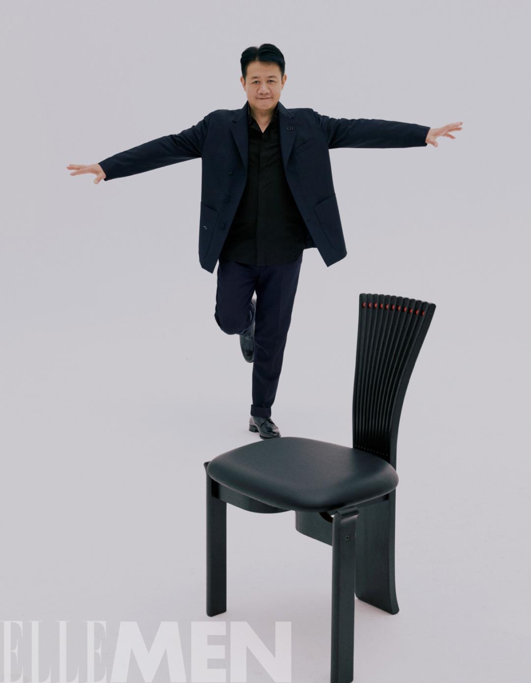 深蓝色羊毛西装外套和黑色棉质衬衫 均为Dior