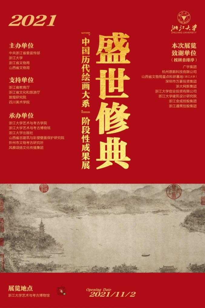 本次展览是浙江大学艺术与考古博物馆开馆以来以中国画作为主要内容的最大规模展览,分为核心馆、专题馆和特色馆。其中,核心馆着重展示“大系”工程的工作脉络;专题馆从“大系”上万件调色打样稿中选出素材,组成了两个专题展览——“国光新辉”和“观无尽藏”;特色馆通过现代科学技术还原佛光寺数字化保护成果,用科技手段实现了文物的活化。展览时间:2021年11月2日起