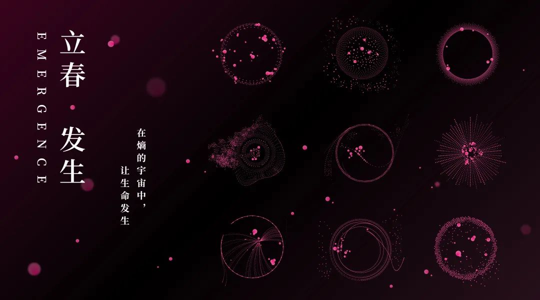“立春·发生”是德国空间叙事团队VAVE Studio 与中国的数字艺术团队InsPUMP直觉泵共同创作的一个艺术作品,在一个非自然空间内,用虚拟视觉和机械矩阵的方式,把立春时节桃花开放的自然现象高度抽象和浓缩,释义“熵减”现象,用生命对抗时间之矢。展览时间:2022年1月26日开展