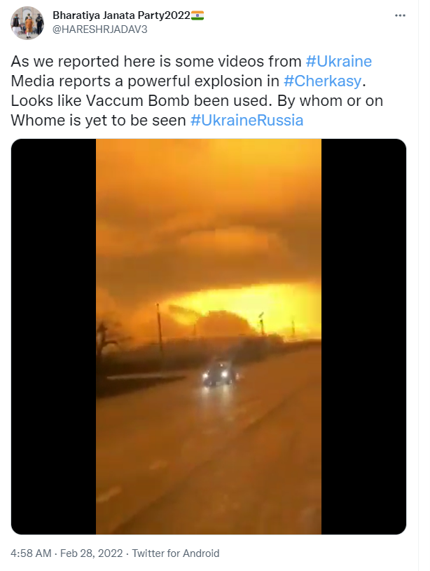 - 这是俄军在乌克兰切尔卡瑟州使用“炸弹之父”吗?不是,尽管网传视频显示的爆炸规模可谓“巨大”,但和“炸弹之父”相比仍难以企及,且视频中也未出现温压弹爆炸常有的两次规模不同且前后发生的爆炸画面,因此从该视频中,无法得出俄罗斯在乌克兰切尔卡瑟州使用“巨型燃料空气炸弹”乃至“炸弹之父”的结论。