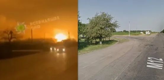 @john_marquee锁定了视频可能被录制的地点在东经30.1018、北纬48.7421,将原视频画面(左)和谷歌地球的3D街景图像(右)进行比对,可以发现,视频中呈现的路口、弯道走向以及周边的树木和弯道处矗立的长杆与街景中的地理信息元素均相符。图片来源:@john_marquee