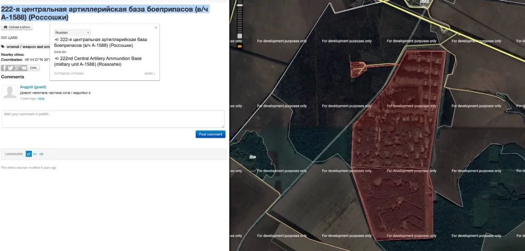 将此地理坐标与wikimapia上标记的6座位于乌克兰切尔卡瑟州的武器库位置进行比对,可以发现,视频摄制的地点与其中一家被命名为“第222号中央炮兵武器库”(222nd Central Artillery Ammunition Base)的位置十分接近。经比例尺测算,二者的直线距离约有3.63公里。