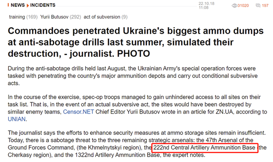 censor.net在2018年10月22日发表的文章中提到了“第222号中央炮兵武器库”,并注明了其所在地位于切尔卡瑟地区。