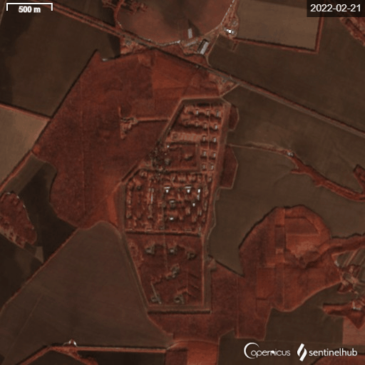 EO Browser卫星图像显示,在2月21日至26日之间,“第222号中央炮兵武器库”附近的地表似乎已经产生了明显的变化,26日抓取的卫星图地面上出现了较为明显的深色痕迹。