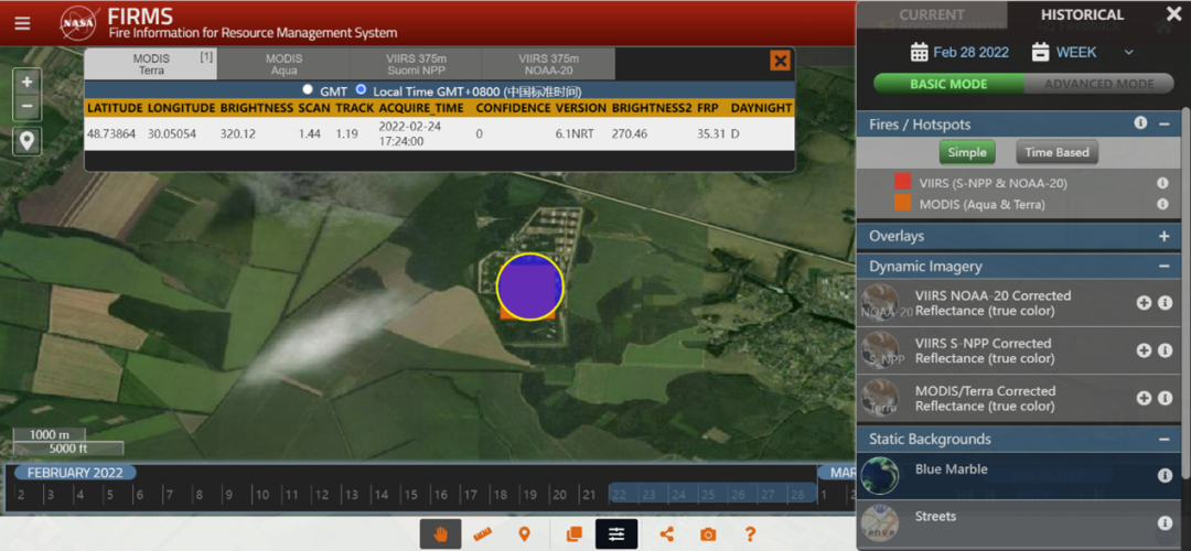 而利用NASA的热异常卫星图像,将时间锁定至2月28日至之前一周,则最终可以确认,在当地时间2月24日,也就是俄军进攻乌克兰的首日,位于切尔卡瑟州的“第222号中央炮兵武器库”附近发生过一次疑似爆炸的事件。