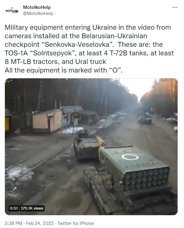 从2月24日开战至今,多方证据显示,俄罗斯在乌克兰确实部署了TOS-1A。例如在2月24日,有在白俄罗斯-乌克兰边境的摄像头捕捉到一辆TOS-1A进入乌克兰的画面。2月26日,有更多视频显示装载有TOS-1A的军用卡车从俄罗斯的别尔哥罗德地区出发,向乌克兰方向移动。
