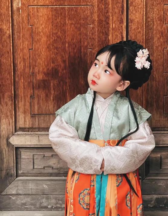 唐式大袖衫是盛唐以后,胡服影响衰弱后所流行开来的服饰,一般多为妇女服装,袖宽往往四尺以上,中晚唐时期上升为贵族礼服,一般多在重要场合穿着,如穿着这种礼服,发上还簪有金翠花钿,所以又称“花钗大袖”。作为文化的一个重要方面,唐代汉服服装,从特定角度体现了唐代这种繁荣、恢弘、大气的文化特征,呈现出当时华丽开放的审美风尚。据材料记载,公元828年,唐文宗宣旨:今后每逢召对之日,不得广插钗梳,不可穿胡服特点的短窄衣服。唐文宗认为,中华应该有中华的装束,怎能追捧胡人的装束呢?况且,短窄衣男女无别,是有悖礼教的。所以,他降旨要求公主们在觐见之日,要穿上中华之衣裳,以做天下表率。文宗之后,比较肥大的女装样式开始兴起。人们开始舍得在衣袖和裙裾上使用大量的好面料,它们的长、宽都比初唐时多了1倍左右,贵族妇女身穿锦绣长裙,裙子用锦带系于胸部,宽大的下摆托在地上,上身不穿厚厚的内衣,而代之以一件薄薄的透明纱衣。脖子、胸、手臂大部分都露在外面,风流百态,以女性特有的妩媚打破传统的封闭。从此,大袖衫开始走入历史画卷。