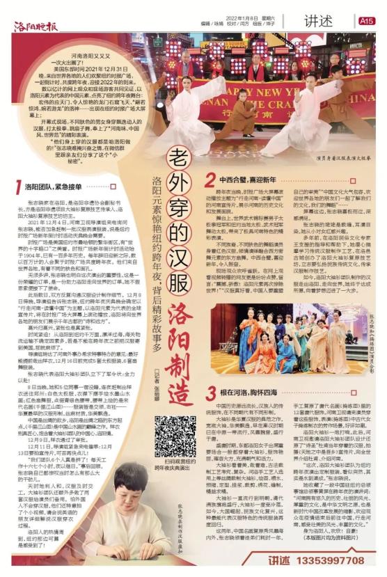 2022年年初张志晓受河南卫视向邀赶制纽约时报广场新年倒计时庆典晚会汉服表演服装,使洛阳元素惊艳了纽约的跨年夜。