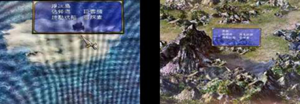 在开放战略地图的界面上,游戏中频繁出现宝物、仙人、坐骑、神兽和妖魔,因此该系列游戏后来也被玩家调侃为《三国群魔传》。以《群英VII》中妖魔角色的出现地点为例,如图6所示:双尾妖兽出现在我国西部沙漠的“荒漠露营”、青鳞水妖则生活在远离大陆东南方的“沧霓礁”(图6右上方还有一个随机出现的水妖)、巨雪熊居于北方“浮冰岛”、黑玉妖蟒则盘踞在南方多泽地带的“黑水”。由此可见,西部、南部、北部、东部分别对应着沙漠、沼泽、岛屿、雪地的地理环境,它们不仅远离国人所居住的中原大地,更是我国仙侠奇幻类型故事中“四海之外”的妖魔鬼怪的盘踞之地。