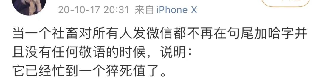 而对于这个社会上压力最大的一群上班族,似乎已经没有什么能阻止他们用“哈”进行群体性的社交粉饰了。除非他忙到快猝死了。