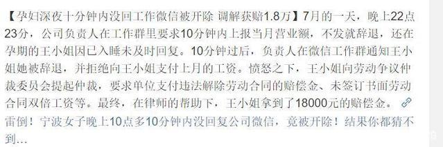 ·人又要麻过去了2018年7月,已经怀孕的王小姐,因为晚上10:23在工作群里收到上司的工作消息10分钟内没回复,被单方面直接开除了。