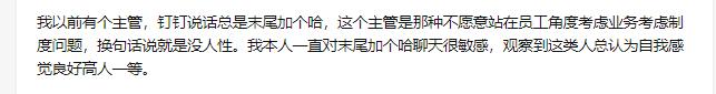 当然,这个“哈”同样也广泛适用于上下级和同事关系。领导会对你说“你今晚加个班哈”,你会对领导说“我明天请个假哈”,同事有时也会让你“帮忙捎杯咖啡哈”。