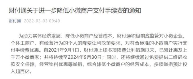 据财付通通知,自2021年9月1日,财付通上线多项降费让利措施。该活动将持续至2024年9月30日;同时,还将继续通过免费提供二维码收款安全保障、经营物料优惠等举措,综合降低小微商户的经营成本。