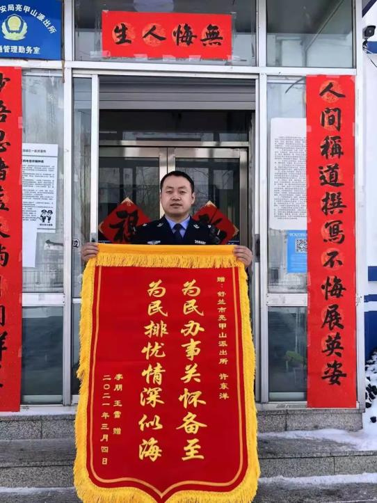 许东洋说着,从卷柜里拿出一面锦旗。锦旗是亮甲山村一社村民王雪送的,上面写道:“为民办事关怀备至,为民排忧情深似海,赠:亮甲山派出所户籍民警许东洋,2021年3月4日”。