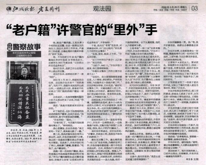 许东洋却从不摆“老资格”,始终恪守着“人民警察为人民”的宗旨,在户籍岗位上兢兢业业,努力做到让群众满意。