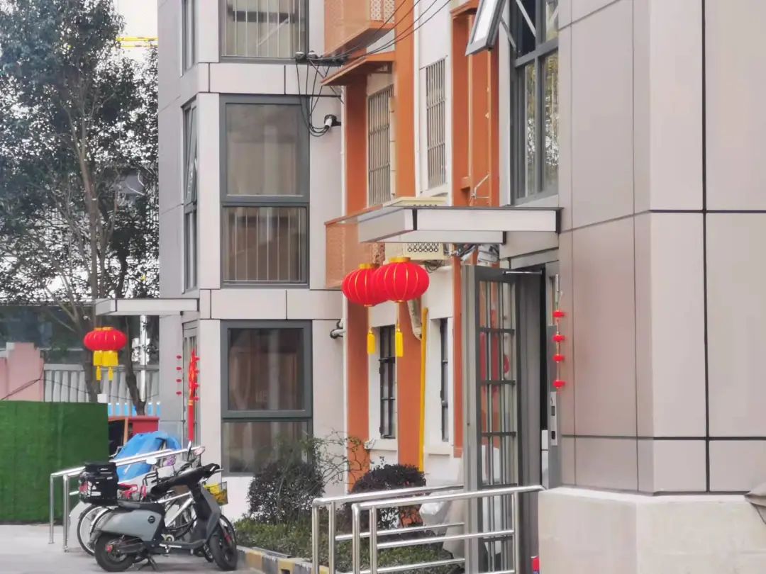 修缮一新的老公房内部公区整洁敞亮,木扶手、防滑地砖,于细节处体现对老人小孩的友好;米色咖啡色相拼的外立面典雅清新,电梯入户门口高挂的大红灯笼透露出满满的喜气,这一番由内而外的改变,让建于上世纪90年代的老公房如获新生,居民们说:“不输商品房,我们的小区有气质了!”