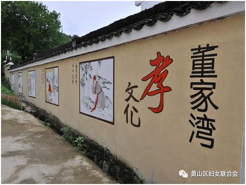 进入村组,两侧可见的是文化墙,这里有董家湾村训——“百善孝为先,善为德之本”,有印刻着董家湾村全体村民的精神信仰的“孝子牌坊”,有一面笑脸墙,这些老人因为子女孝顺,家庭和睦,满脸洋溢出幸福的“笑”。