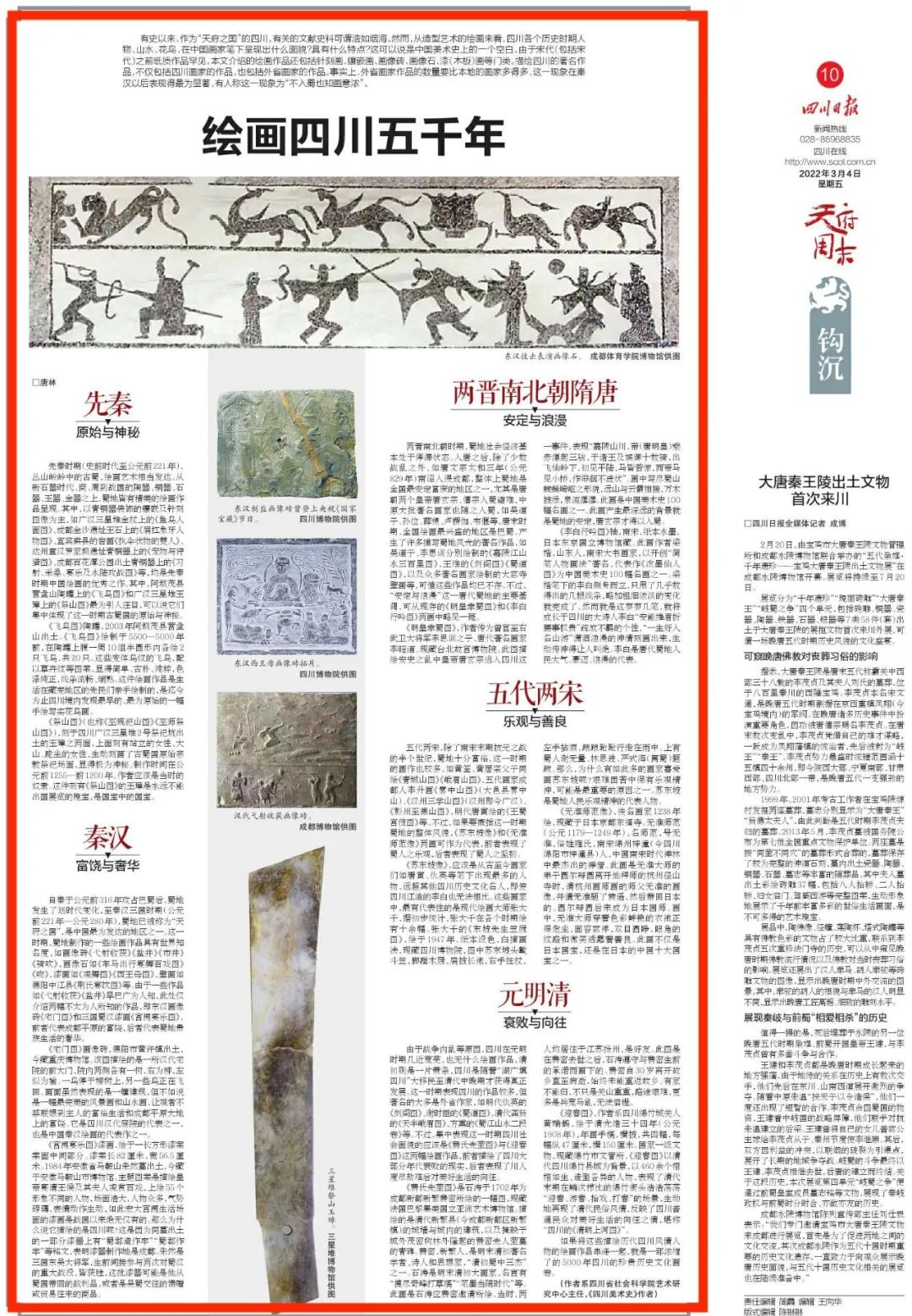 小编的话四川日报3月4日刊登我院艺术研究中心主任唐林撰写的文章《绘画四川五千年》。全文如下:
