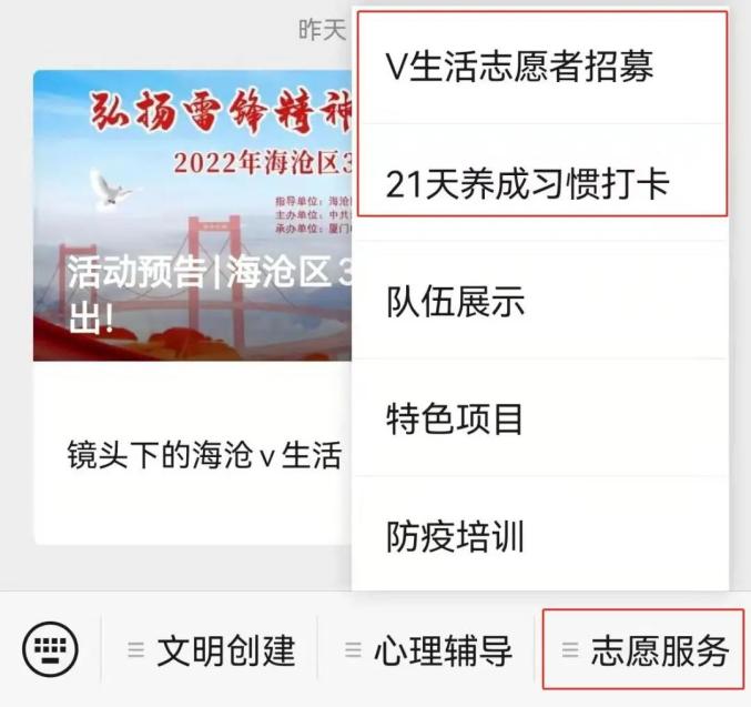 “点亮未来”只是海沧“学雷锋志愿服务活动月”系列活动的其中一项。3月5日上午,海沧还在线上通过云端万屏启动“海沧 V 生活” 品牌项目,将“全民打卡+理念宣传+成果展示”线上线下多形式联动,进一步涵育主流价值,培育文明新风。