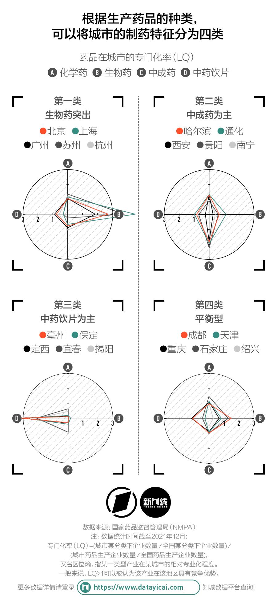 新一酱通过生产范围编码匹配的方式得到所有企业的制药类型,并引入了专门化率(LQ)的算法,计算各城市中这四类药品的相对优势度。LQ>1可以认为该类药品在该城市的生产中具有优势。专门化率越高,说明这个城市的该类药企在全国范围内越有优势。