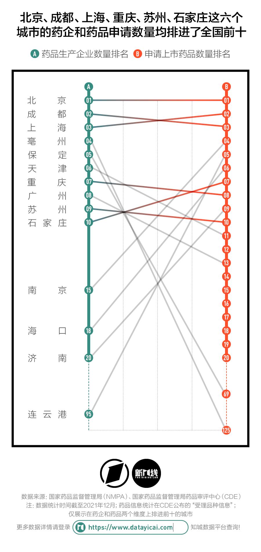 企业数量排名全国第95位的连云港可以说是一个相对特殊的例子。这座城市仅有24家药企,但依靠于江苏恒瑞、正大天晴、康缘药业和豪森药业这四家本地龙头药企的持续创新,以及政策的大力倾斜,其申请上市的药品数量排到了全国第5的位置。