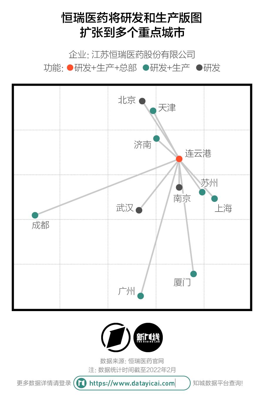 以总部设立在连云港的江苏恒瑞医药股份有限公司为例,其官网信息显示,目前公司在全国10个城市都设有分支,其中武汉、南京、北京仅负责研发,其余7个城市兼备研发和生产的功能——北至天津、南至广州、西至成都、东至上海。