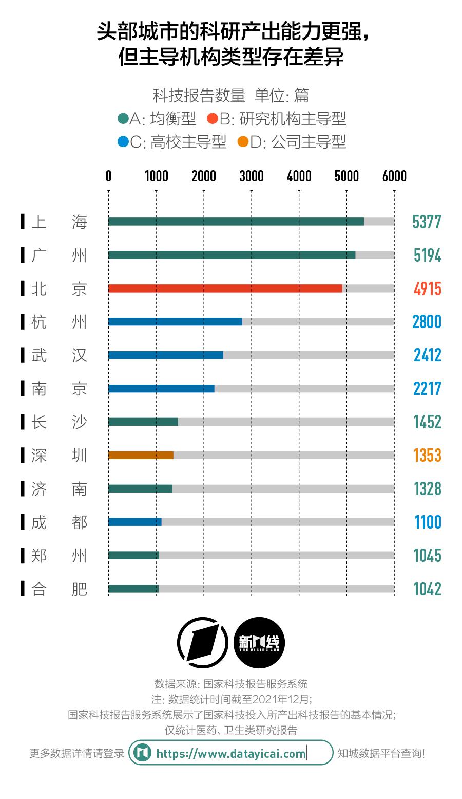 数据表明,以上海为代表的6个城市的科研产出,主要由高校和医院牵头完成;而以杭州为代表的4个新一线城市,医疗资源稍弱,其80%以上的科研报告出自高校。