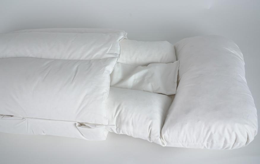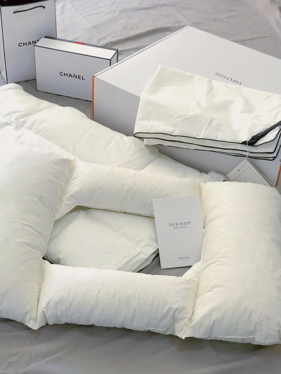 1.打开枕头看看就知道,它是两个嵌套在一起的羽绒枕头。枕套内四角各有一根绑带,可与枕芯牢牢固定,起到止滑的作用,在洗涤后也方便晾晒。2.枕头内芯结构设计很特别,分成5个区域,软硬高低都专门做了调整,分别适应头颈曲线的曲度。