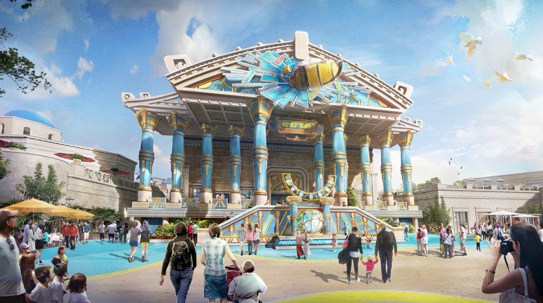 众神之战街区飞翔影院项目建筑效果图项目规划设计沉浸式丝路数字艺术中心,打造沉浸式、交互式数字体验;结合各街区主题,以旋转、飞行、骑乘等不同类型设备,将游玩设施和场景相融合,让游客从一扇扇“科技之门”穿梭往返,从文化的“旁观者”,变成文化的“体验者”“创造者”。