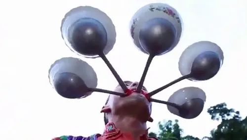跳菜者的姿势各异,变化多端,刚柔相济,旋转自如,有的用头顶,有的用手托,有的用肩抬,甚至嘴巴也有用武之地,身体的托菜功能被开发到了极限。嘴巴能托多少盘菜,取决于能咬住多少根汤勺。