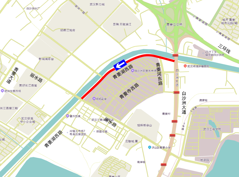 2、原由南向北通行施工路段去往青菱河东路沿线以及白沙洲大道(青菱湖西路至丽水路)西侧单位及门店的车辆,可通过丽水路、青菱寺西路绕行。