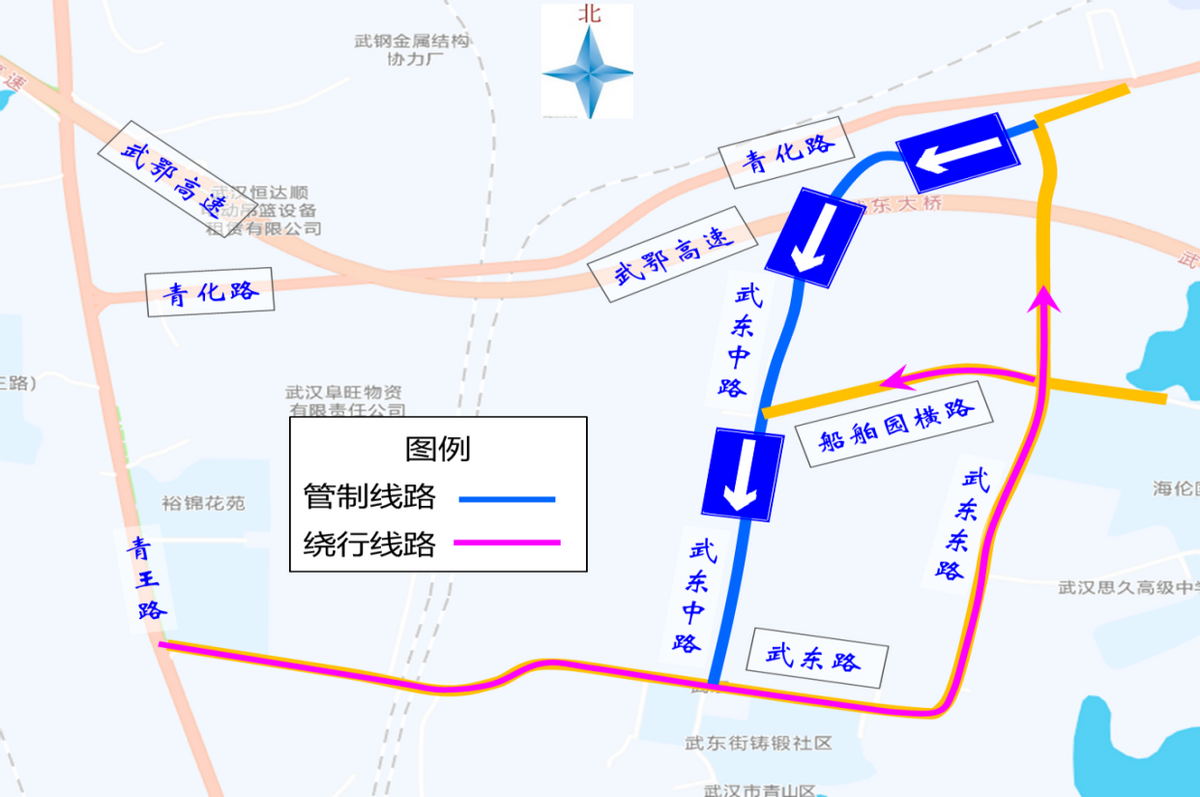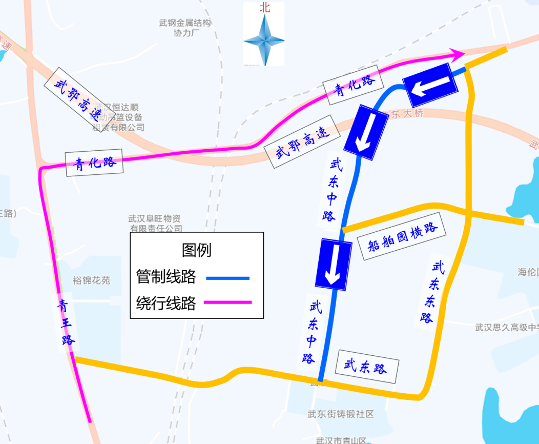 1、原武东路去往武东中路和船舶园横路沿线的车辆绕行武东东路。
