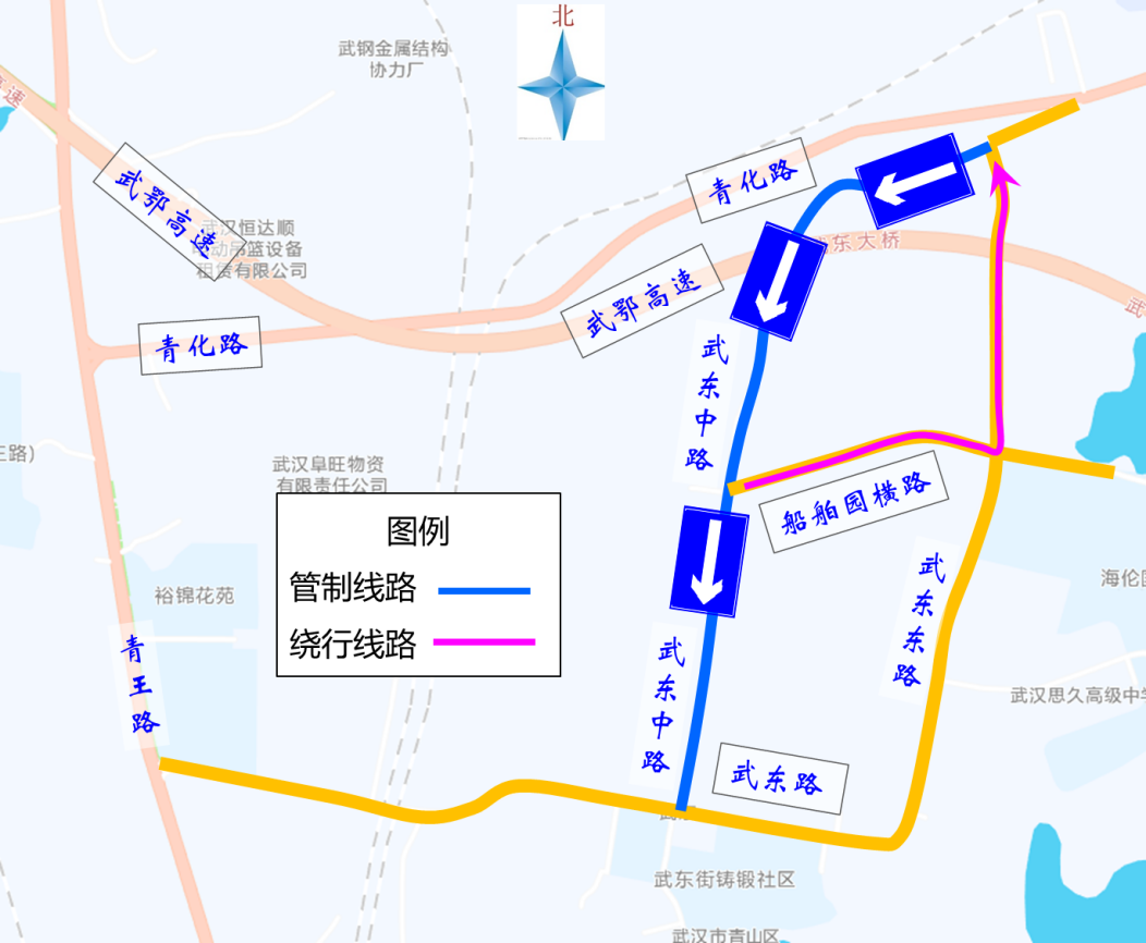 2、原船舶园横路去往青化路方向的车辆绕行武东东路。